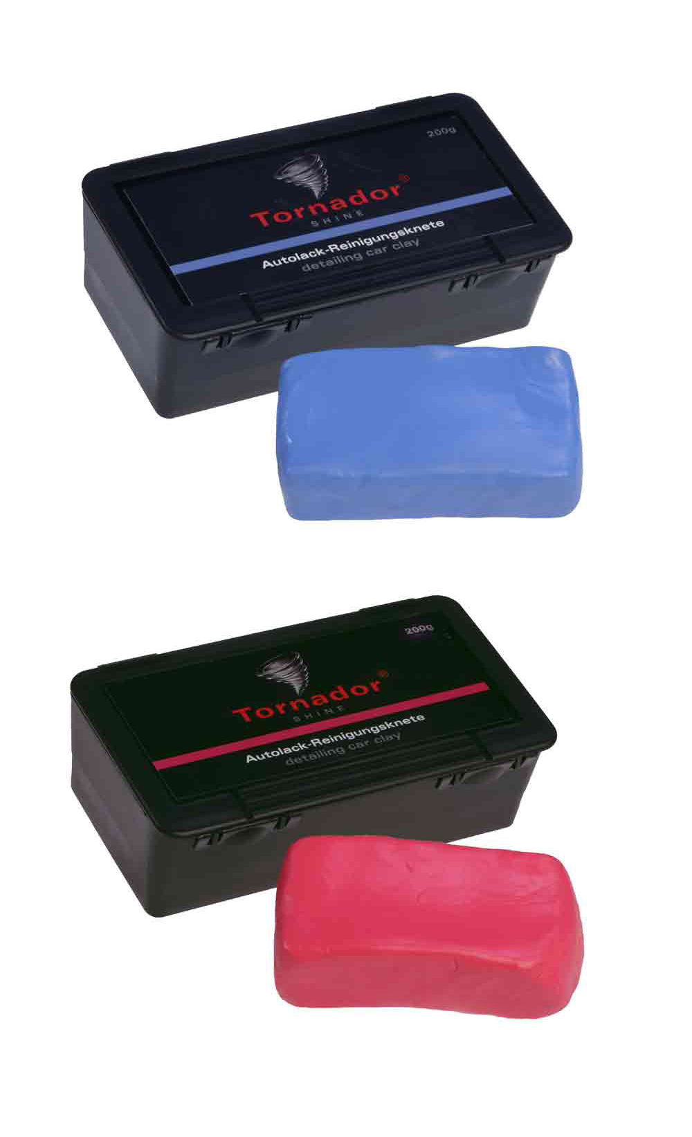 Tornador® SHINE es la preparación perfecta para la limpieza y el cuidado de pinturas de vehículos contaminadas. Tornador® SHINE es el ayudante ideal para eliminar las sedimentaciones, como p. ej. partículas de óxido adheridas, alquitrán, resina de árbol, insectos o también restos de pulverización de pintura o de color. Tornador® SHINE le ayuda a limpiar la superficie de pintura de su vehículo. Tornador® SHINE suelta las sedimentaciones más resistentes sobre todas las superficies lisas, como p. ej. pintura, cristal, cromo, etc. Para el grado de suciedad respectivo usted recibirá la masilla de limpieza y cuidado Tornador® SHINE diseñada de manera correspondiente.